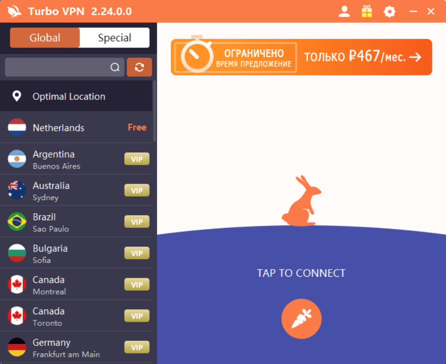 Нажмите на кнопку с морковкой для запуска ВПН. Вы можете дополнительно выбрать нужный вам сервер из бокового меню. Для отключения ВПН, повторно нажмите на кнопку с морковкой. Обратите внимание, что для доступа к платным серверам вам необходимо войти в свой аккаунт.
